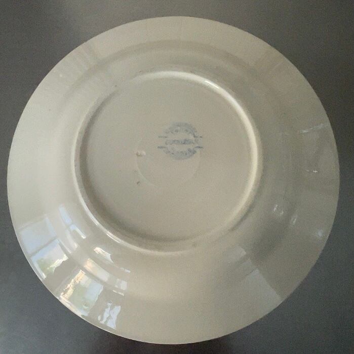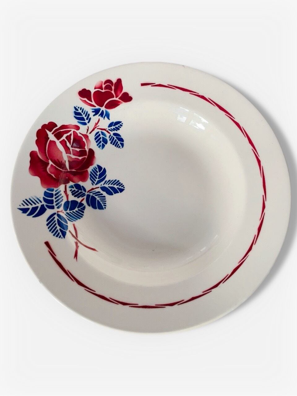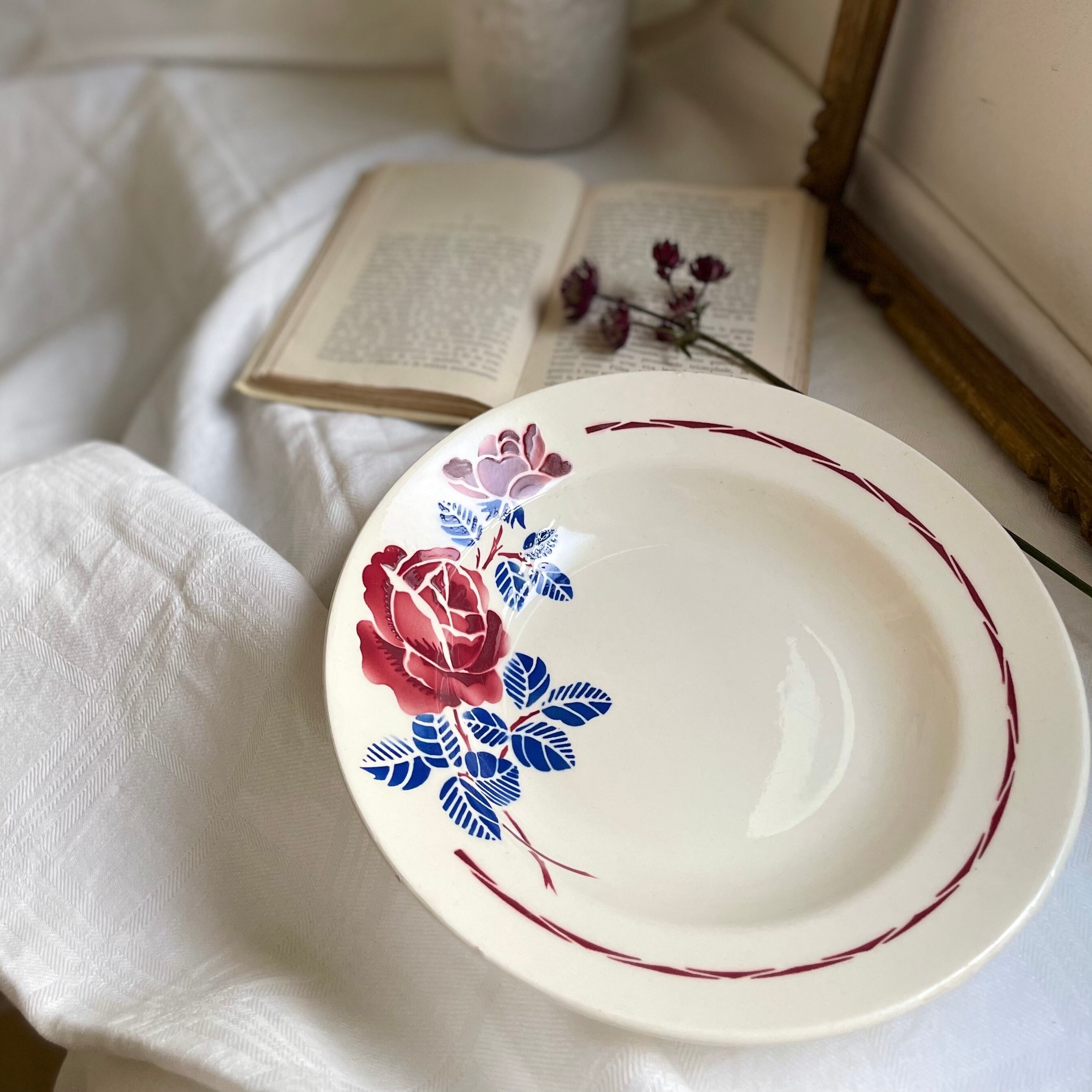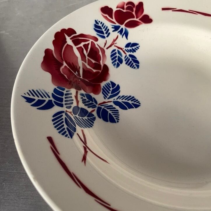 フランスBadonvillerスープ皿ステンシル薔薇ボルドーレッド×青い葉