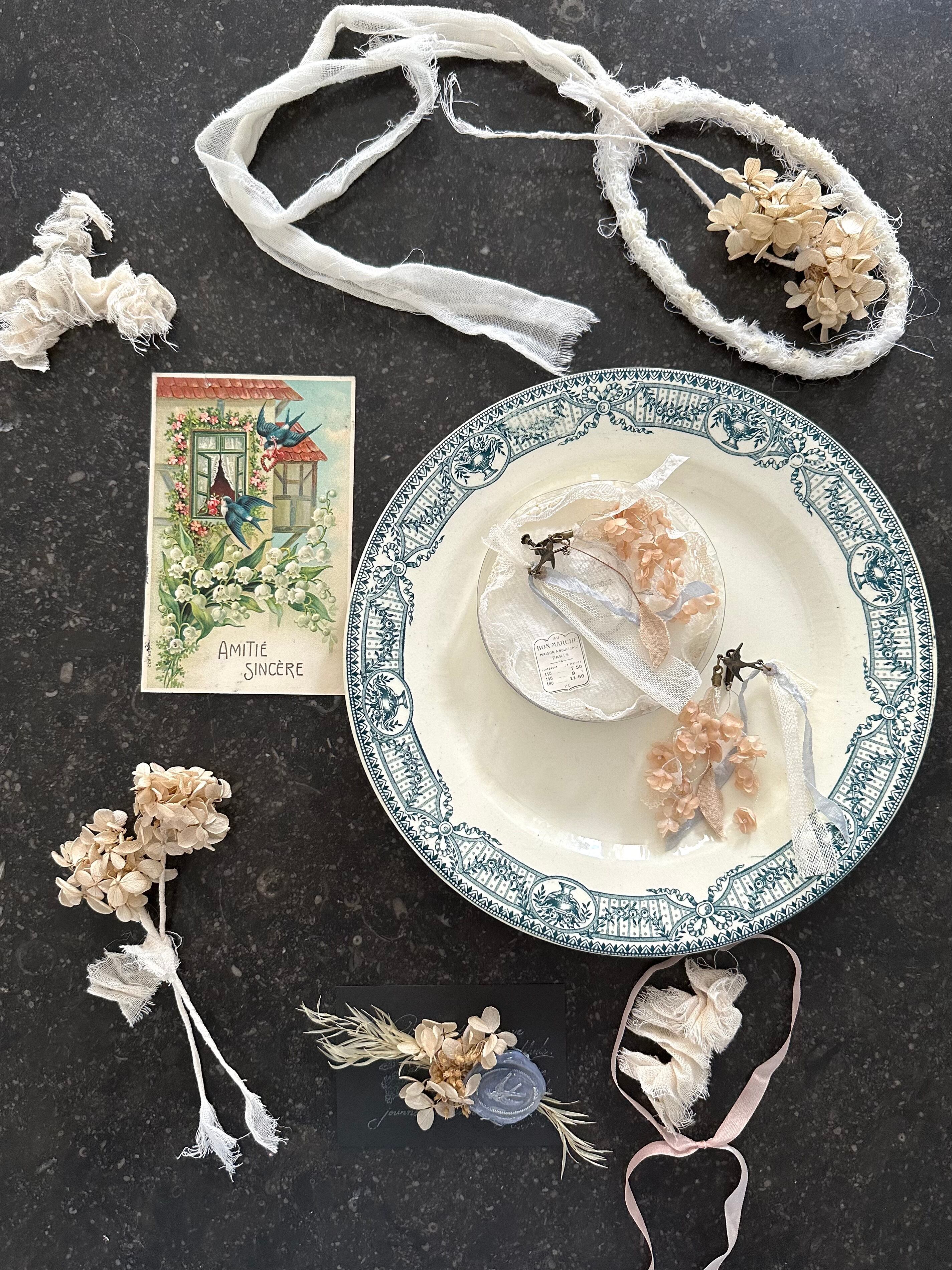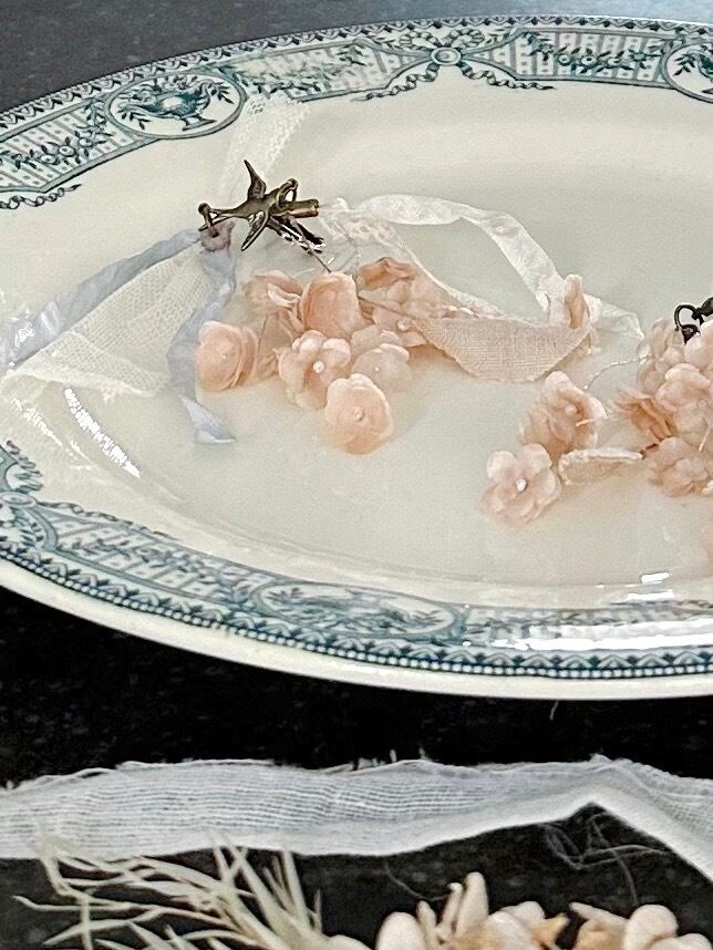 リム部分のリボン、ボタニカルなデザインの可愛いらさもありながら、古書のインクカラーのようなブルーグリーンが落ち着いた印象です。