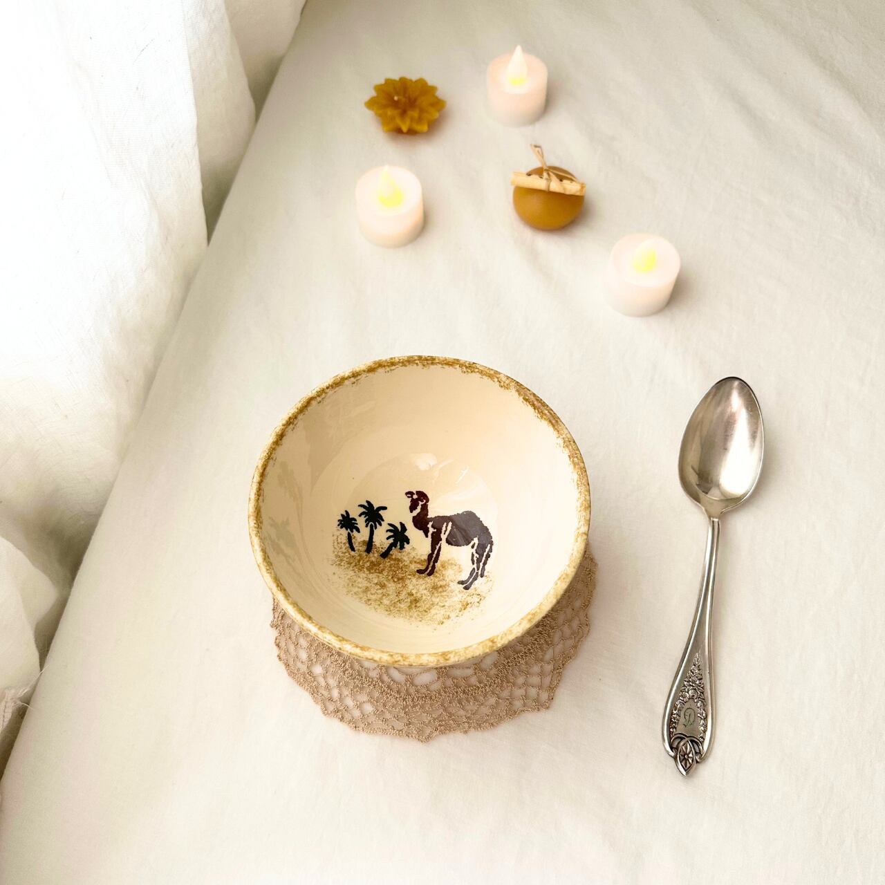 砂漠のラクダの絵柄がボウルの外側と中にも描かれています。